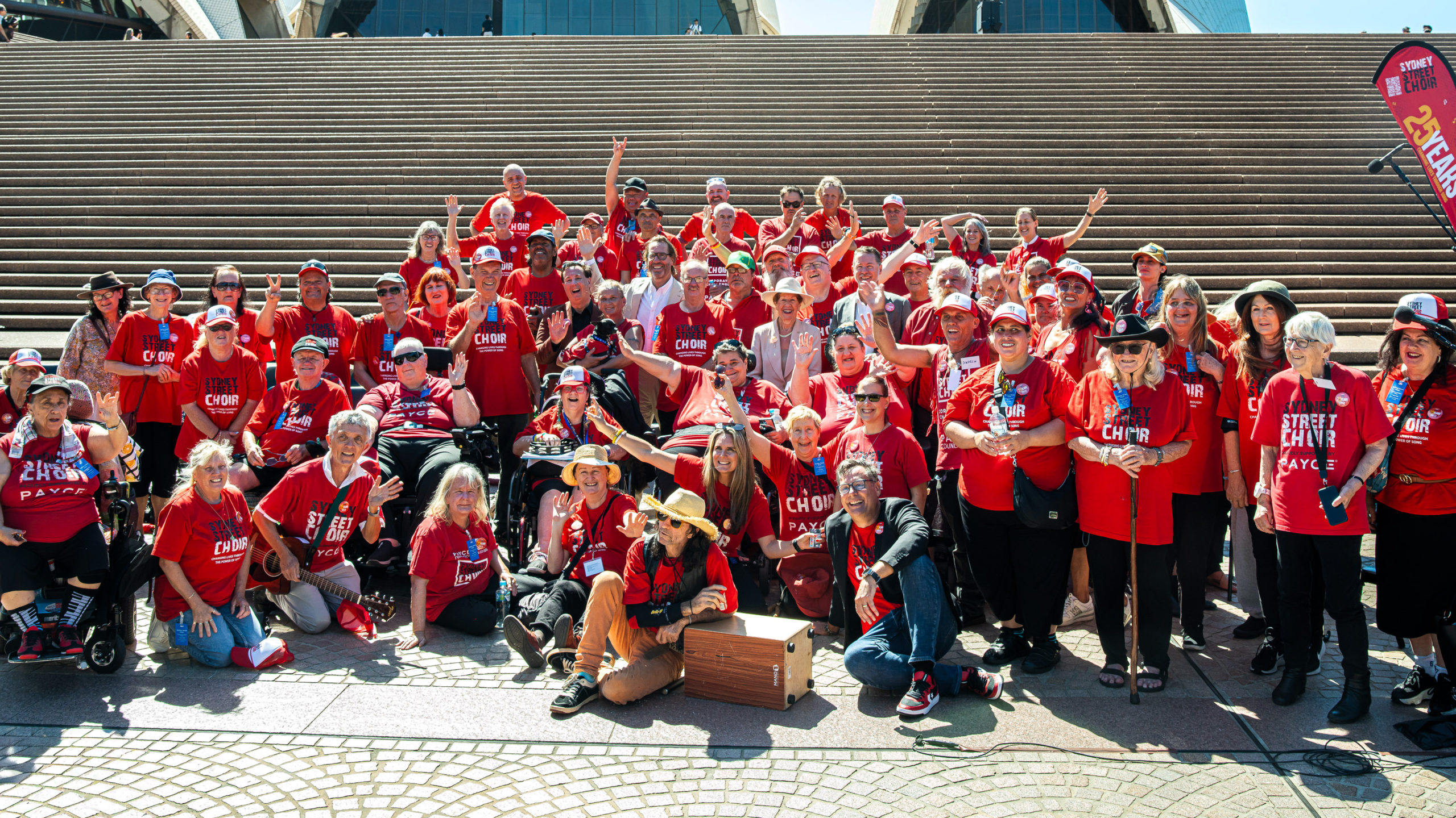 Past and present members of the Sydney Street Choir took to the steps of the Sydney Opera House to mark the occasion with a free public concert, the launch of a new single, and an opening Acknowledgement of Country performed by First Nations didgeridoo player William Barton.